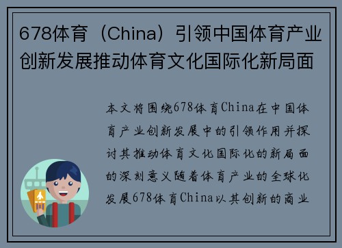 本文将围绕678体育(China)在中国体育产业创新发展中的引领作用,并探讨其推动体育文化国际化的新局面的深刻意义。随着体育产业的全球化发展,678体育(China)以其创新的商业模式、技术应用及市场战略,不仅在国内市场占据重要地位,还在国际市场上开创了全新的发展局面。文章将从四个方面进行详细分析:首先,讨论678体育(China)在体育产业中的创新商业模式;其次,分析其通过技术驱动促进体育产业升级的举措;第三,阐述678体育(China)如何推动体育文化的国际化交流;最后,探讨其在全球体育产业链中的地位与影响力。通过这些分析,本文旨在展现678体育(China)如何通过创新和国际化战略,助力中国体育产业走向世界舞台,提升其国际竞争力。